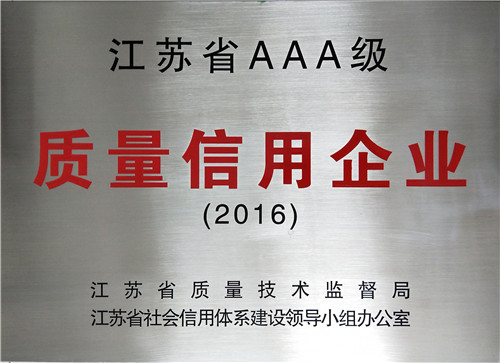 近日,江苏省质量技术监督局向我公司颁发了 “江苏省AAA质量信用企业”奖牌,我司成为江苏省质量信用最高等级企业。